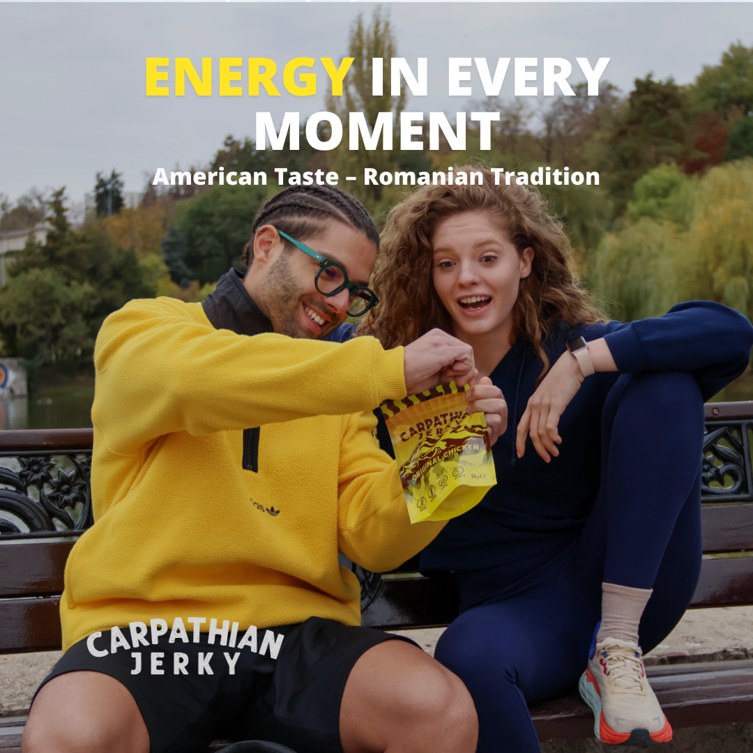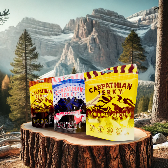 Jerky des Carpates C'est le premier jerky 100 % roumain, offrant aux aventuriers le goût authentique de notre terroir. Le jerky de bœuf offre une texture croustillante, tandis que le jerky de poulet est plus moelleux, idéal pour tous les goûts.
